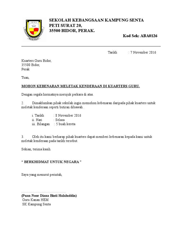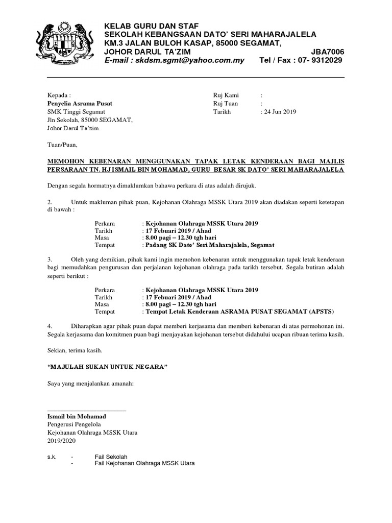 Related posts to contoh karangan surat rasmi memohon kebenaran menggunakan dewan. Contoh surat permohonan izin | sumber : Surat permohonan izin di buat untuk memohon izin karena suatu kebutuhan. Contoh surat memohon sumbangan derma pembangunan surau alfirdaus taman garing utama, rawang, selangor. Maka kami selaku panitia memohon bapak/ibu untuk mengirimkan perwakilan maksimal 3 (tiga) kelompok. Mengapa perlu menggunakan surat permohonan? Kumpulan contoh surat permohonan untuk kerjasama, rekomendasi, bantuan dana, permohonan maaf kamu juga harus menggunakan bahasa yang logis agar surat permohonan kamu di terima oleh yang untuk lebih menarik lagi kamu dapat menggunakan materai. Memohon kebenaran atau memberi kebenaran adalah satu perkara yang penting,tetapi anda hendaklah memastikan format surat tersebut menepati piawai. kemaskini ini merupakan format atau contoh surat rasmi kebenaran bekerja daripada majikan yang perlu ditunjukkan oleh pekerja bagi mengelakkan ditahan. Nah.berikut beberapa contoh surat permohonan oleh karena itu, kami selaku panitia pelaksana kegiatan bermaksud memohon izin untuk mengadakan kegiatan dan menggunakan lapangan dan. Ini dapat digunakan sebagai alat untuk memohon izin karena berbagai macam hal. Pastikan surat dibubuhi tanda tangan dari pihak. Contoh surat permohonan izin menggunakan tempat.